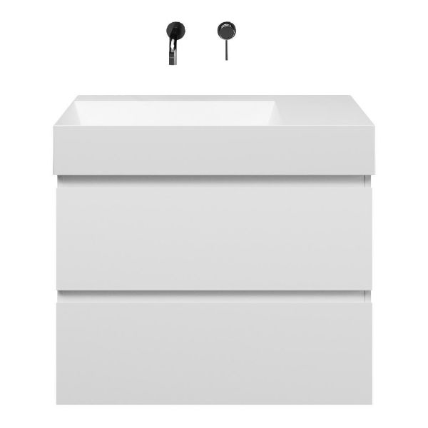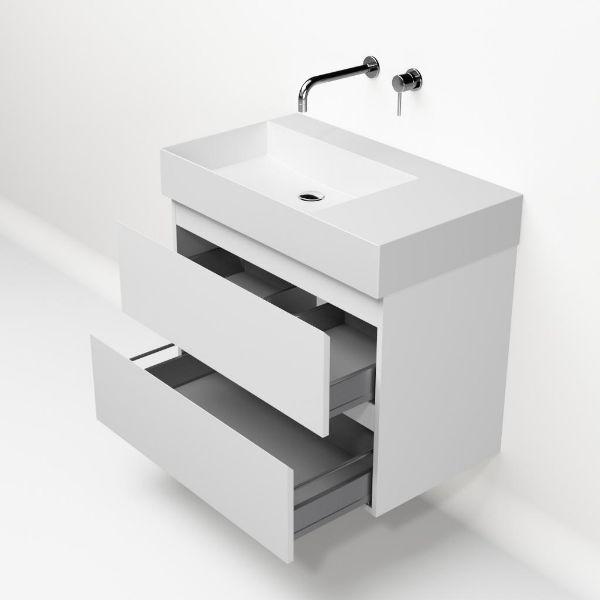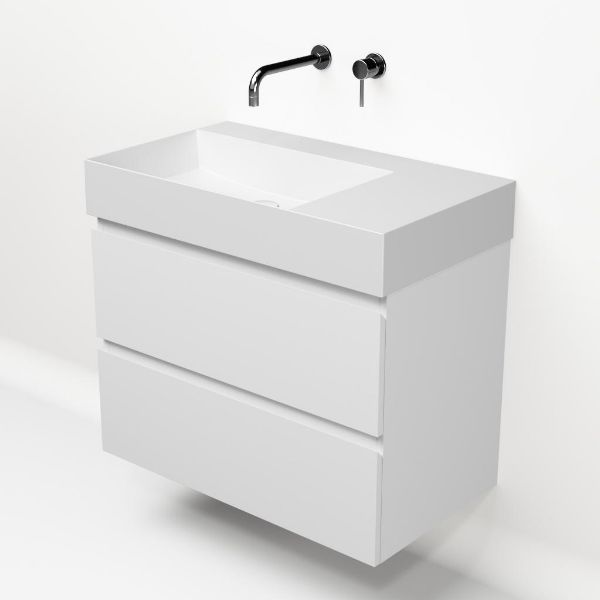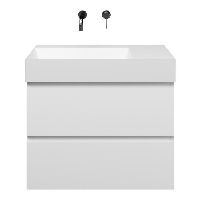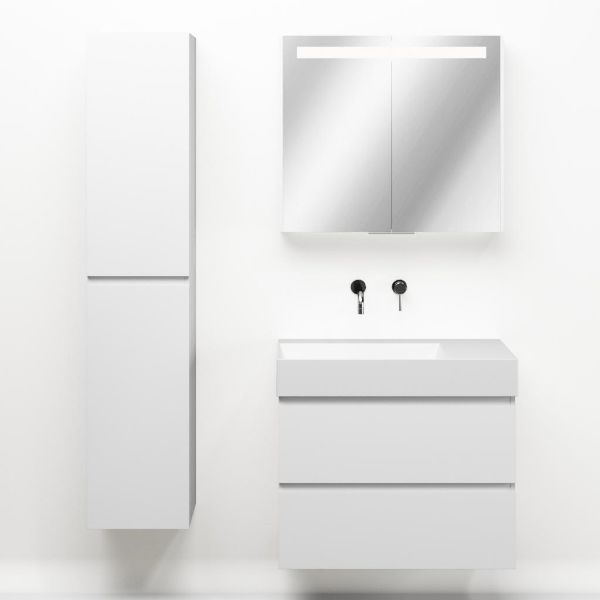 Greeploos badkamermeubel in de kleur wit mat is 80 cm breed. De wastafel is vervaardig in keramiek en heeft de kleur wit mat keramiek. Dit badkamermeubel met deze wastafel is leverbaar tussen de 60 cm t/m 160 cm