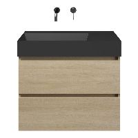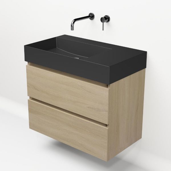 Greeploos badkamermeubel in de kleur eiken licht is 80 cm breed. De wastafel is vervaardig in keramiek en heeft de kleur antraciet mat keramiek. Dit badkamermeubel met deze wastafel is leverbaar tussen de 60 cm t/m 120 cm