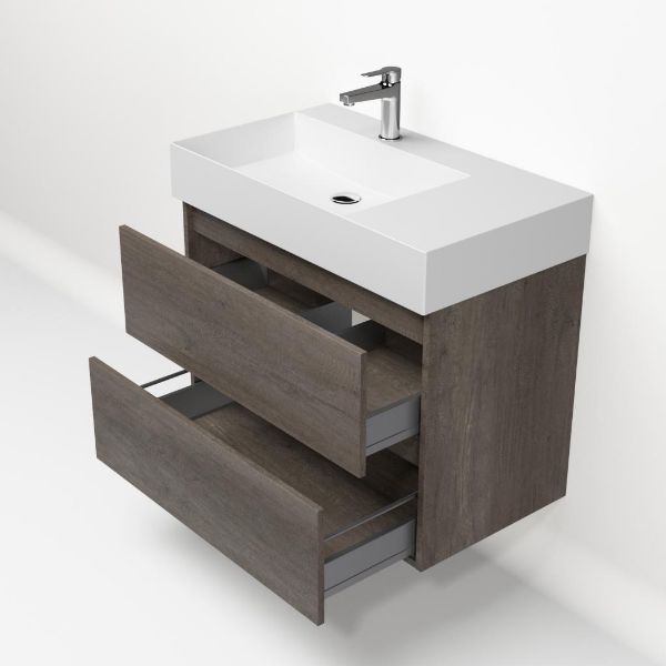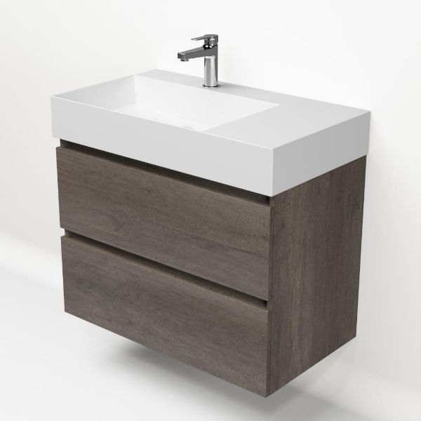 Greeploos badkamermeubel in de kleur olm donker grijs is 80 cm breed. De wastafel is vervaardig in keramiek en heeft de kleur wit mat keramiek. Dit badkamermeubel met deze wastafel is leverbaar tussen de 60 cm t/m 120 cm