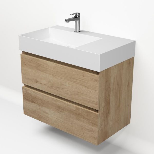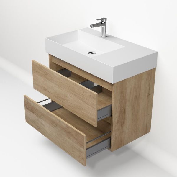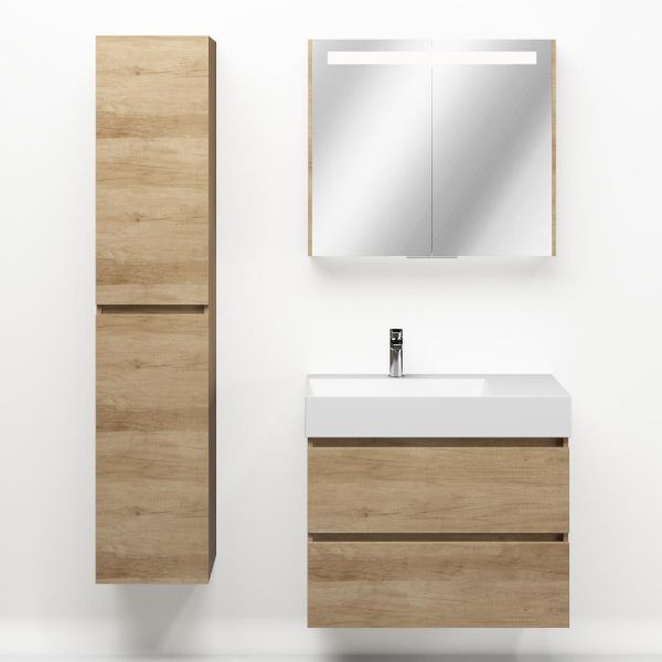 Greeploos badkamermeubel in de kleur olm is 80 cm breed. De wastafel is vervaardig in keramiek en heeft de kleur wit mat keramiek. Dit badkamermeubel met deze wastafel is leverbaar tussen de 60 cm t/m 120 cm