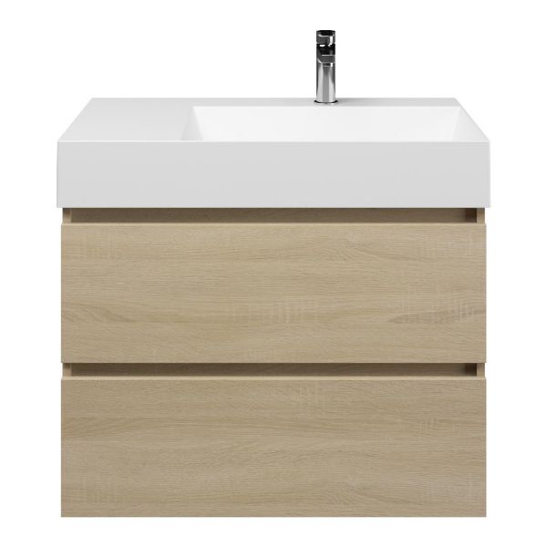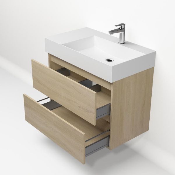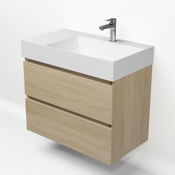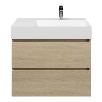 Greeploos badkamermeubel in de kleur eiken licht is 80 cm breed. De wastafel is vervaardig in keramiek en heeft de kleur wit mat keramiek. Dit badkamermeubel met deze wastafel is leverbaar tussen de 60 cm t/m 120 cm
