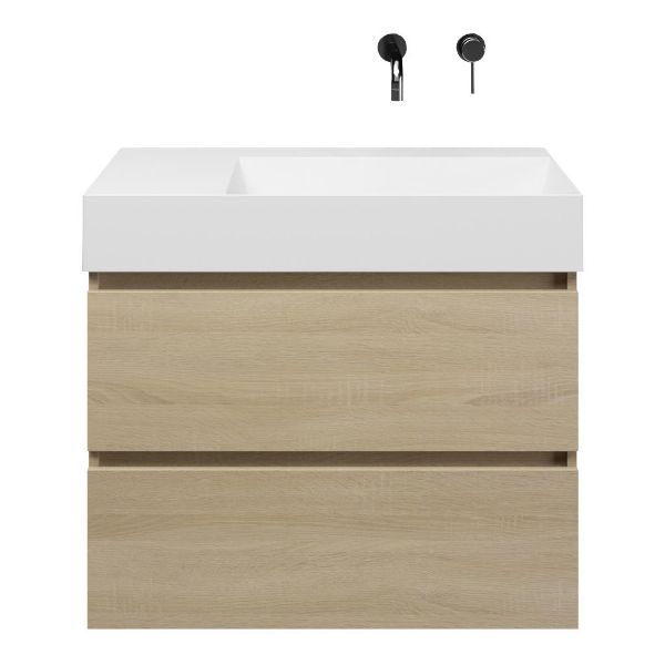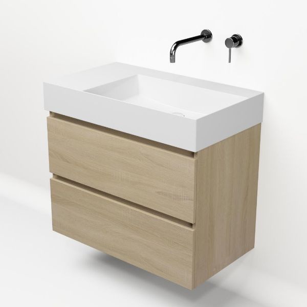 Greeploos badkamermeubel in de kleur eiken licht is 80 cm breed. De wastafel is vervaardig in keramiek en heeft de kleur wit keramiek. Dit badkamermeubel met deze wastafel is leverbaar tussen de 60 cm t/m 120 cm