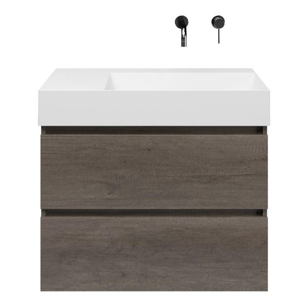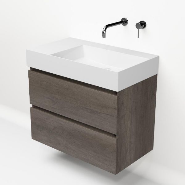 Greeploos badkamermeubel in de kleur olm donker grijs is 80 cm breed. De wastafel is vervaardig in keramiek en heeft de kleur wit keramiek. Dit badkamermeubel met deze wastafel is leverbaar tussen de 60 cm t/m 120 cm