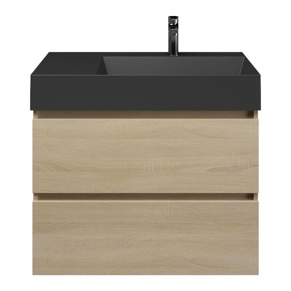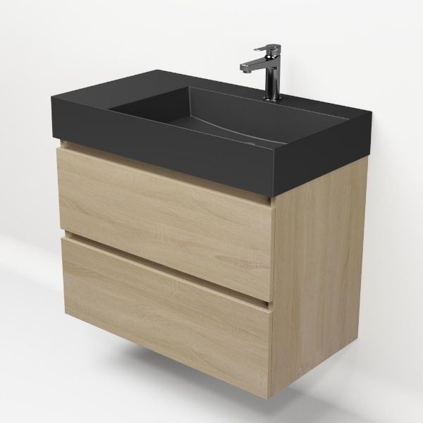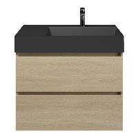 Greeploos badkamermeubel in de kleur eiken licht is 80 cm breed. De wastafel is vervaardig in keramiek en heeft de kleur antraciet mat keramiek. Dit badkamermeubel met deze wastafel is leverbaar tussen de 60 cm t/m 120 cm