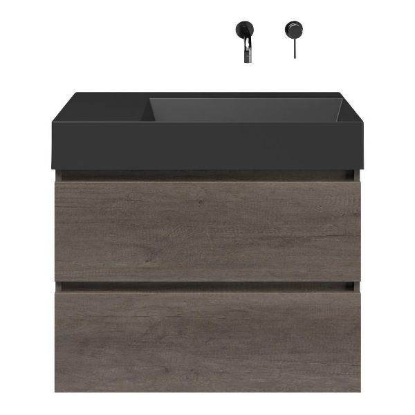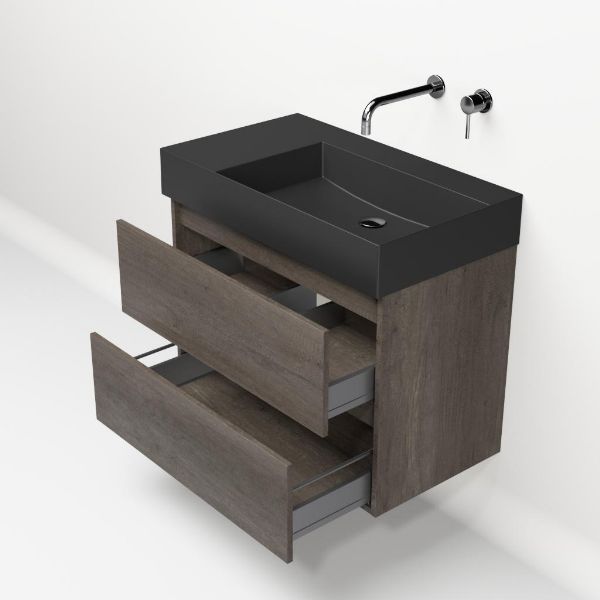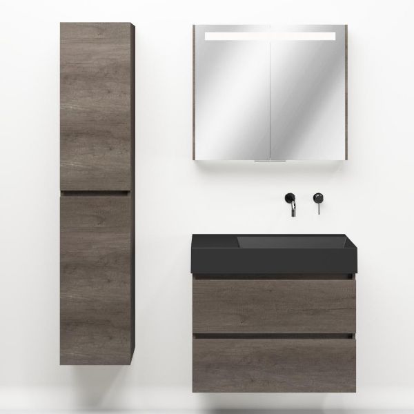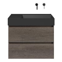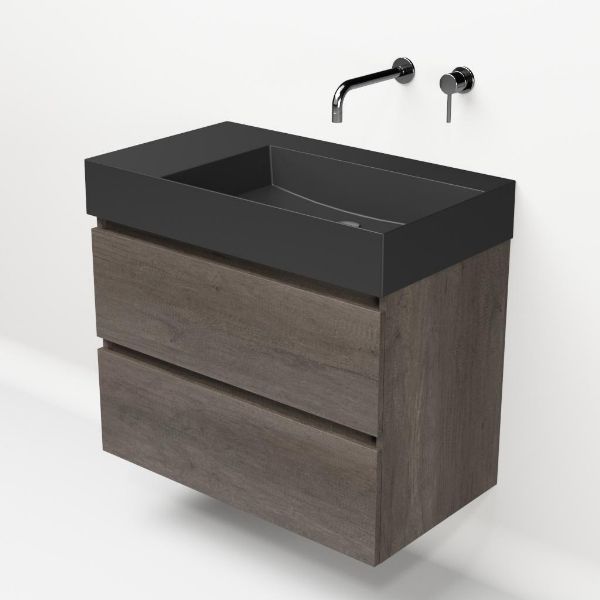 Greeploos badkamermeubel in de kleur olm donker grijs is 80 cm breed. De wastafel is vervaardig in keramiek en heeft de kleur antraciet mat keramiek. Dit badkamermeubel met deze wastafel is leverbaar tussen de 60 cm t/m 120 cm