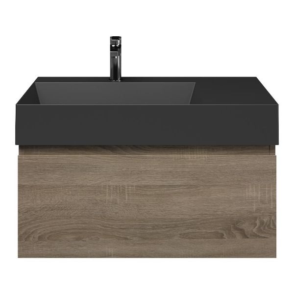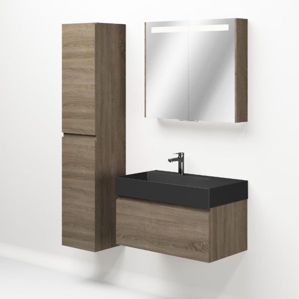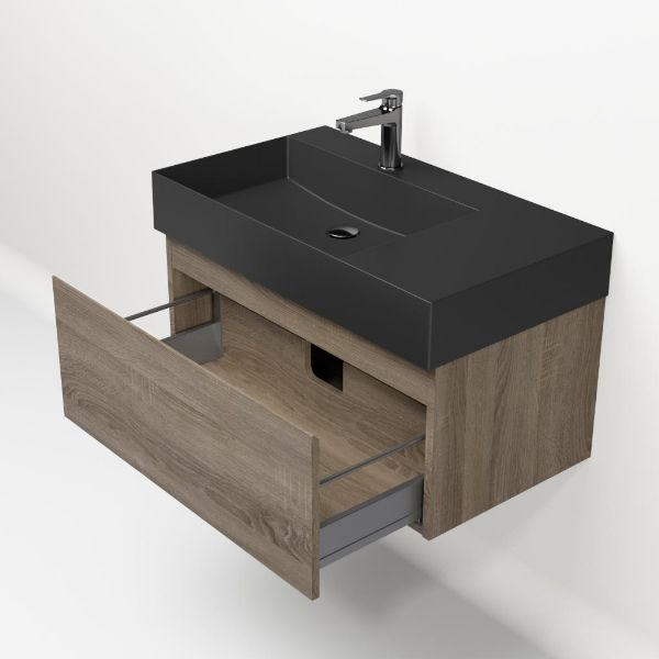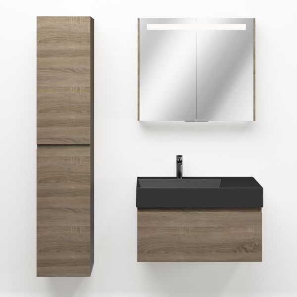 Greeploos badkamermeubel in de kleur eiken donker is 80 cm breed. De wastafel is vervaardig in keramiek en heeft de kleur antraciet mat keramiek. Dit badkamermeubel met deze wastafel is leverbaar tussen de 60 cm t/m 160 cm