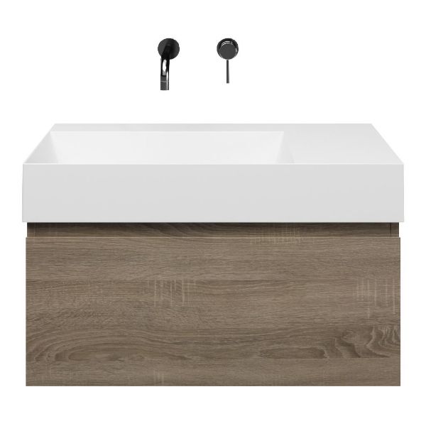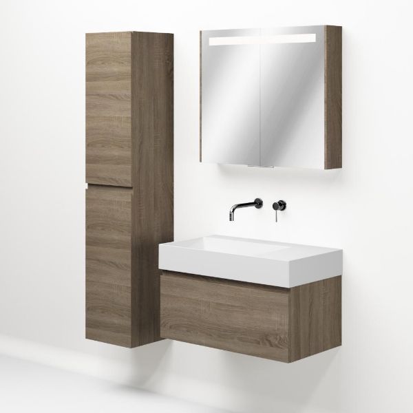 Greeploos badkamermeubel in de kleur eiken donker is 80 cm breed. De wastafel is vervaardig in keramiek en heeft de kleur wit keramiek. Dit badkamermeubel met deze wastafel is leverbaar tussen de 60 cm t/m 160 cm