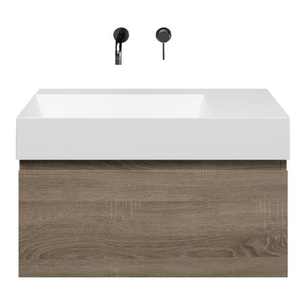 Greeploos badkamermeubel in de kleur eiken donker is 80 cm breed. De wastafel is vervaardig in keramiek en heeft de kleur wit mat keramiek. Dit badkamermeubel met deze wastafel is leverbaar tussen de 60 cm t/m 160 cm