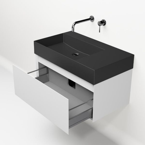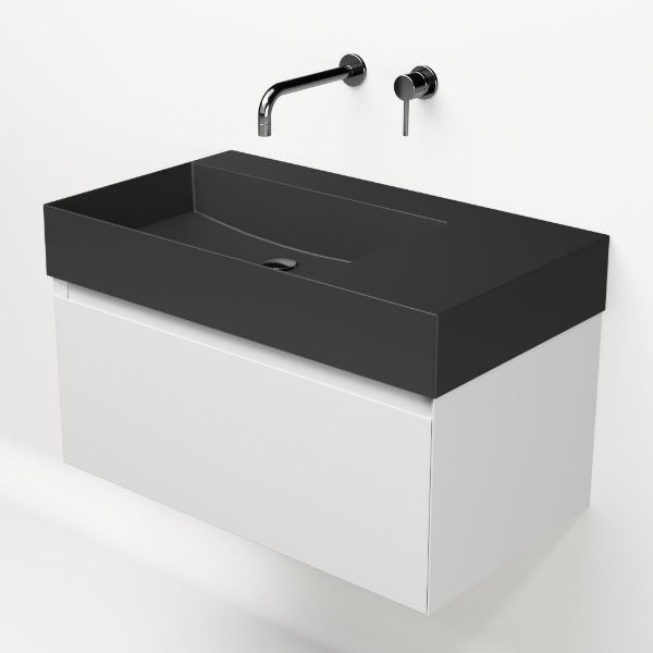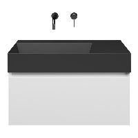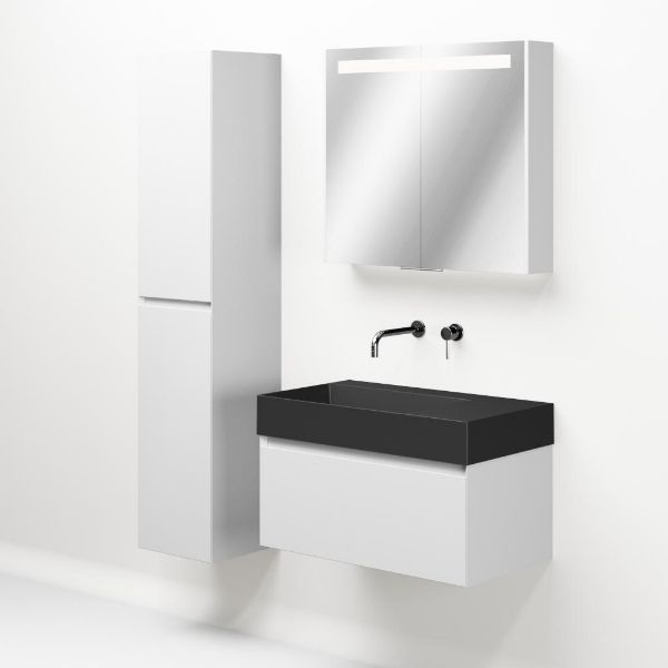 Greeploos badkamermeubel in de kleur wit mat is 80 cm breed. De wastafel is vervaardig in keramiek en heeft de kleur antraciet mat keramiek. Dit badkamermeubel met deze wastafel is leverbaar tussen de 60 cm t/m 160 cm