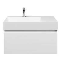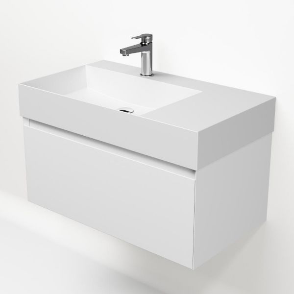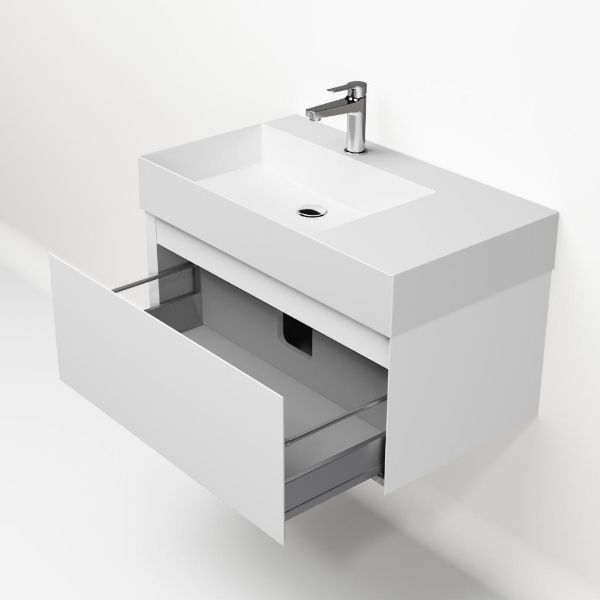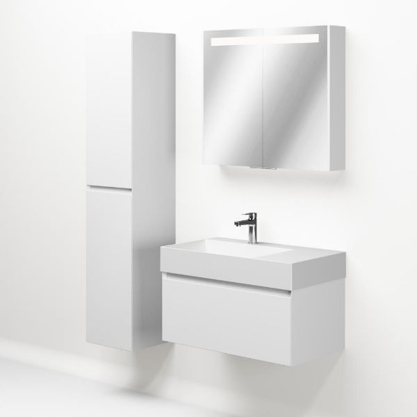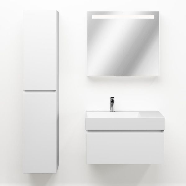 Greeploos badkamermeubel in de kleur wit mat is 80 cm breed. De wastafel is vervaardig in keramiek en heeft de kleur wit mat keramiek. Dit badkamermeubel met deze wastafel is leverbaar tussen de 60 cm t/m 160 cm