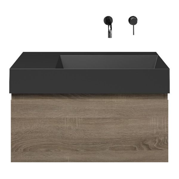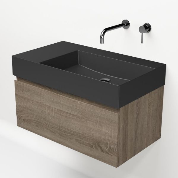 Greeploos badkamermeubel in de kleur eiken donker is 80 cm breed. De wastafel is vervaardig in keramiek en heeft de kleur antraciet mat keramiek. Dit badkamermeubel met deze wastafel is leverbaar tussen de 60 cm t/m 160 cm