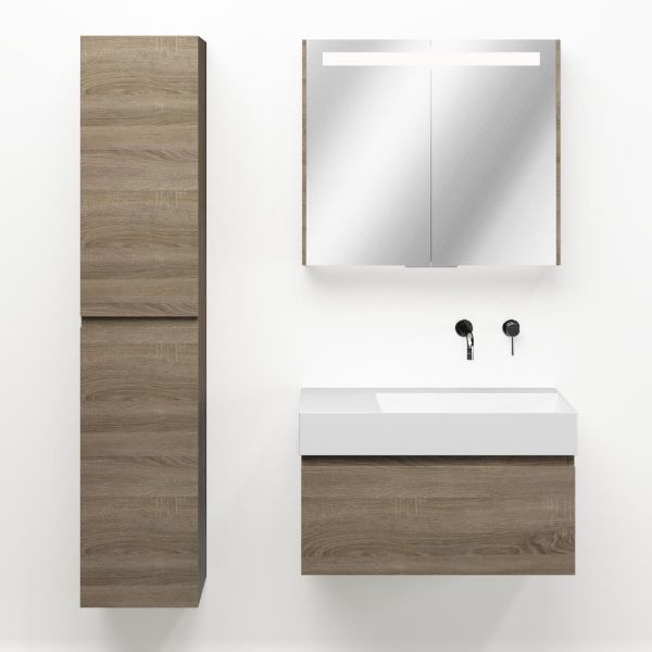Greeploos badkamermeubel in de kleur eiken donker is 80 cm breed. De wastafel is vervaardig in keramiek en heeft de kleur wit mat keramiek. Dit badkamermeubel met deze wastafel is leverbaar tussen de 60 cm t/m 160 cm