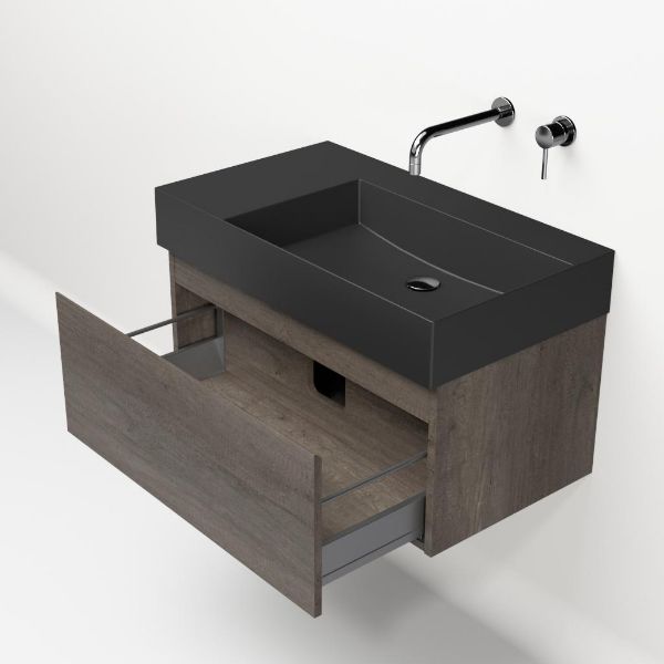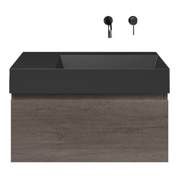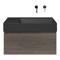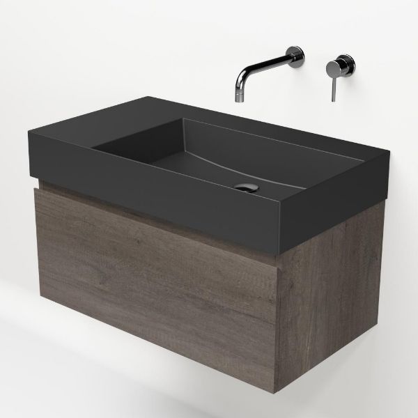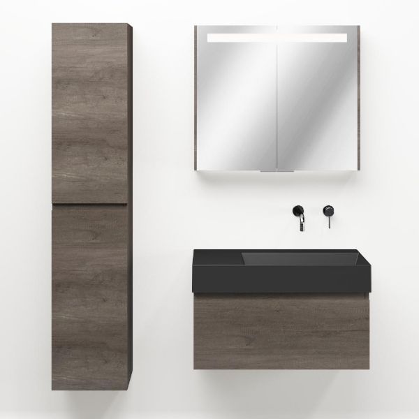 Greeploos badkamermeubel in de kleur olm donker grijs is 80 cm breed. De wastafel is vervaardig in keramiek en heeft de kleur antraciet mat keramiek. Dit badkamermeubel met deze wastafel is leverbaar tussen de 60 cm t/m 160 cm