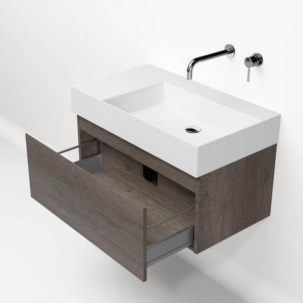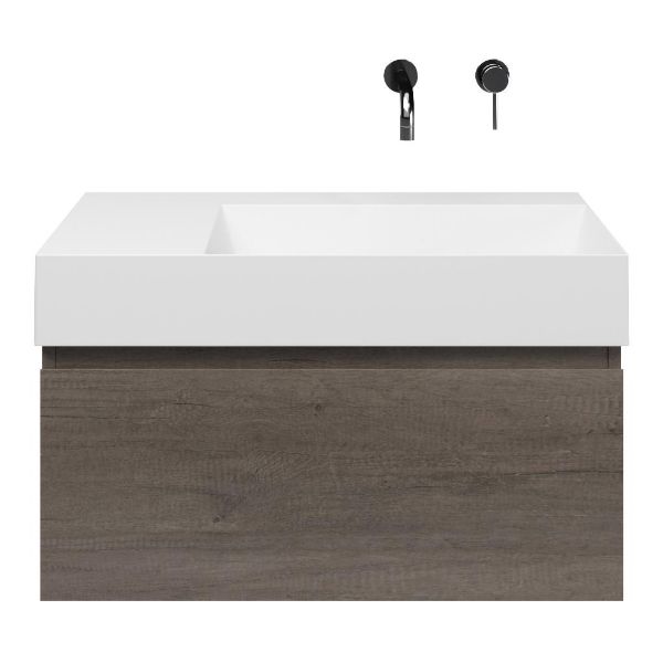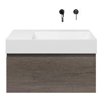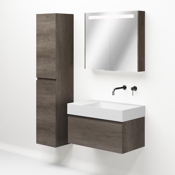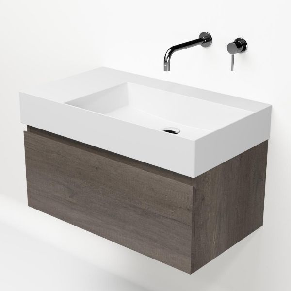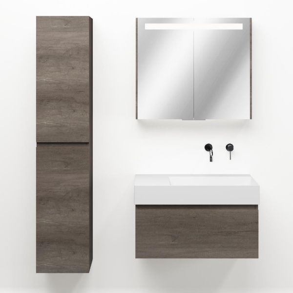 Greeploos badkamermeubel in de kleur olm donker grijs is 80 cm breed. De wastafel is vervaardig in keramiek en heeft de kleur wit keramiek. Dit badkamermeubel met deze wastafel is leverbaar tussen de 60 cm t/m 160 cm