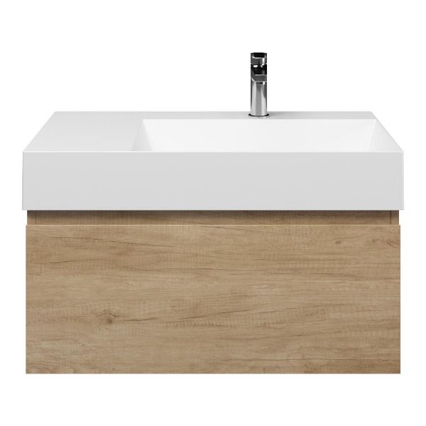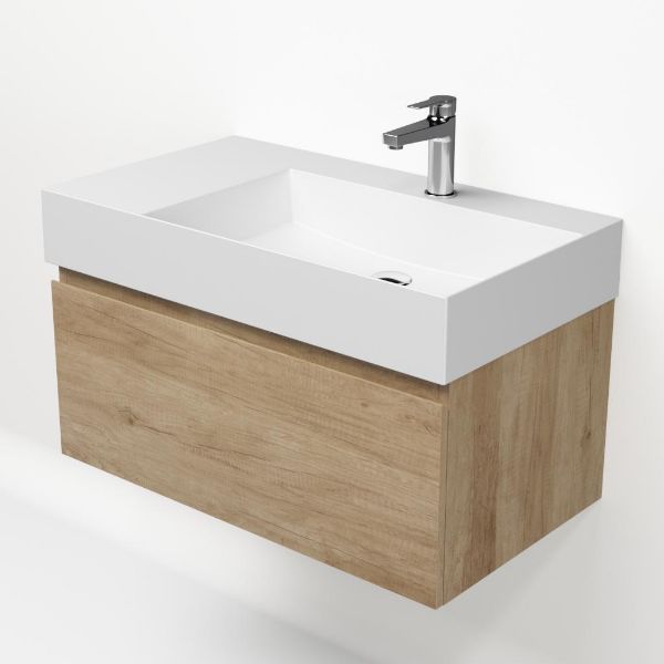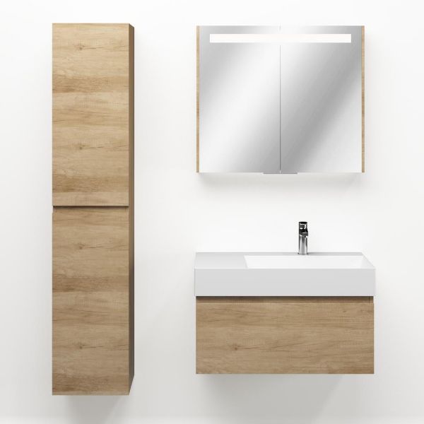 Greeploos badkamermeubel in de kleur olm is 80 cm breed. De wastafel is vervaardig in keramiek en heeft de kleur wit mat keramiek. Dit badkamermeubel met deze wastafel is leverbaar tussen de 60 cm t/m 160 cm