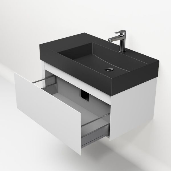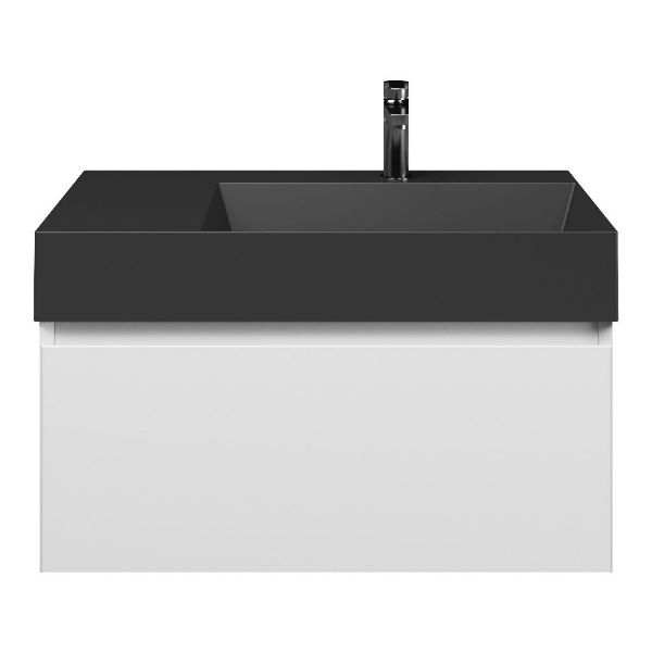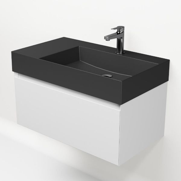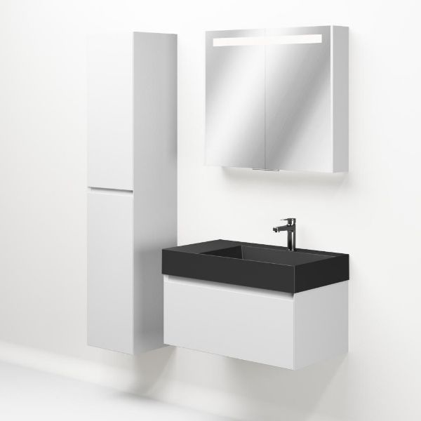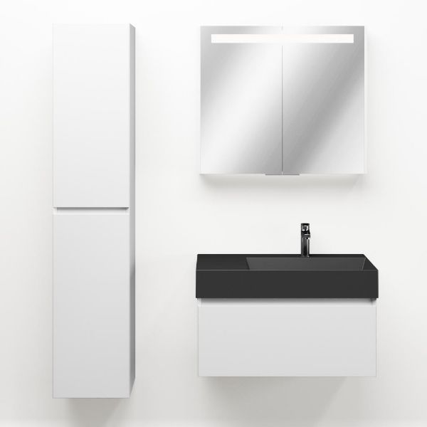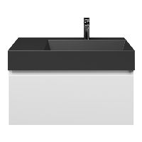 Greeploos badkamermeubel in de kleur wit mat is 80 cm breed. De wastafel is vervaardig in keramiek en heeft de kleur antraciet mat keramiek. Dit badkamermeubel met deze wastafel is leverbaar tussen de 60 cm t/m 160 cm
