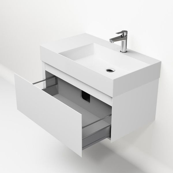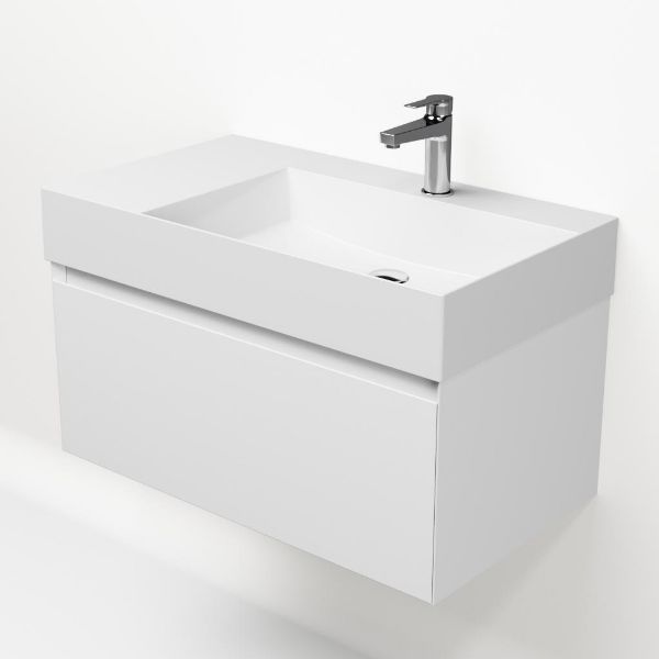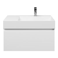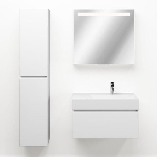 Greeploos badkamermeubel in de kleur wit mat is 80 cm breed. De wastafel is vervaardig in keramiek en heeft de kleur wit keramiek. Dit badkamermeubel met deze wastafel is leverbaar tussen de 60 cm t/m 160 cm