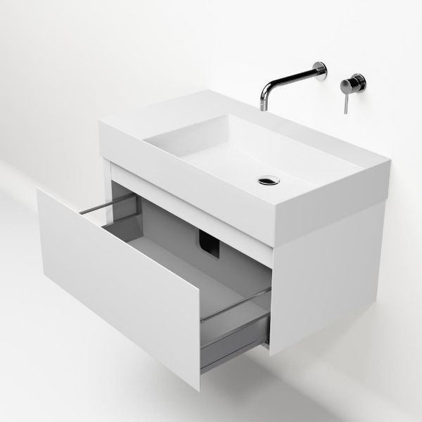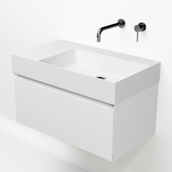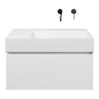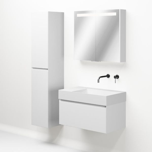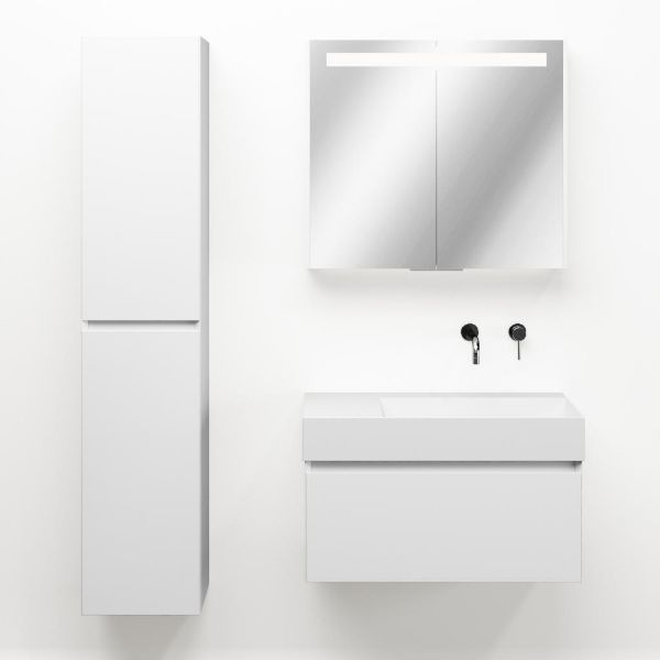 Greeploos badkamermeubel in de kleur wit mat is 80 cm breed. De wastafel is vervaardig in keramiek en heeft de kleur wit keramiek. Dit badkamermeubel met deze wastafel is leverbaar tussen de 60 cm t/m 160 cm
