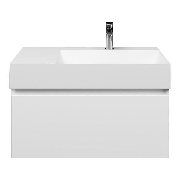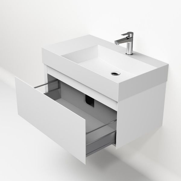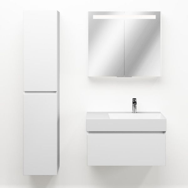 Greeploos badkamermeubel in de kleur wit mat is 80 cm breed. De wastafel is vervaardig in keramiek en heeft de kleur wit mat keramiek. Dit badkamermeubel met deze wastafel is leverbaar tussen de 60 cm t/m 160 cm