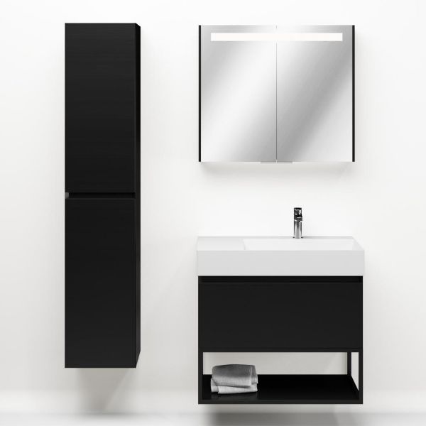 Greeploos badkamermeubel in de kleur zwart mat is 80 cm breed. De wastafel is vervaardig in keramiek en heeft de kleur wit keramiek. Dit badkamermeubel met deze wastafel is leverbaar tussen de 60 cm t/m 140 cm