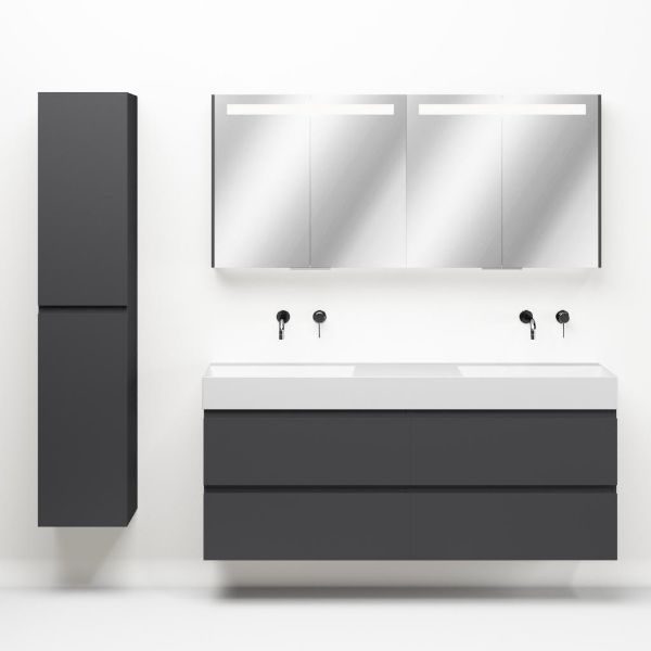 Greeploos badkamermeubel in de kleur antraciet mat is 160 cm breed. De wastafel is vervaardig in keramiek en heeft de kleur wit mat keramiek. Dit badkamermeubel met deze wastafel is leverbaar tussen de 60 cm t/m 160 cm