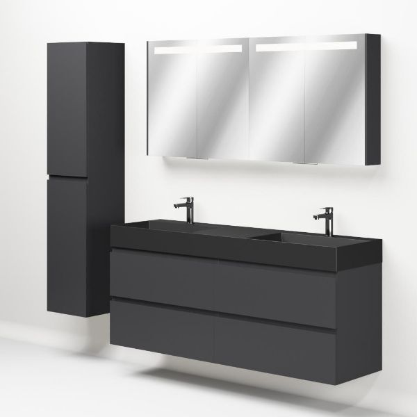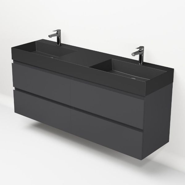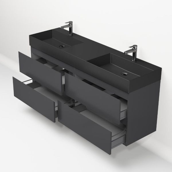 Greeploos badkamermeubel in de kleur antraciet mat is 160 cm breed. De wastafel is vervaardig in keramiek en heeft de kleur antraciet mat keramiek. Dit badkamermeubel met deze wastafel is leverbaar tussen de 60 cm t/m 160 cm