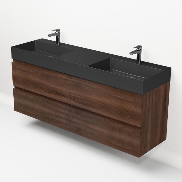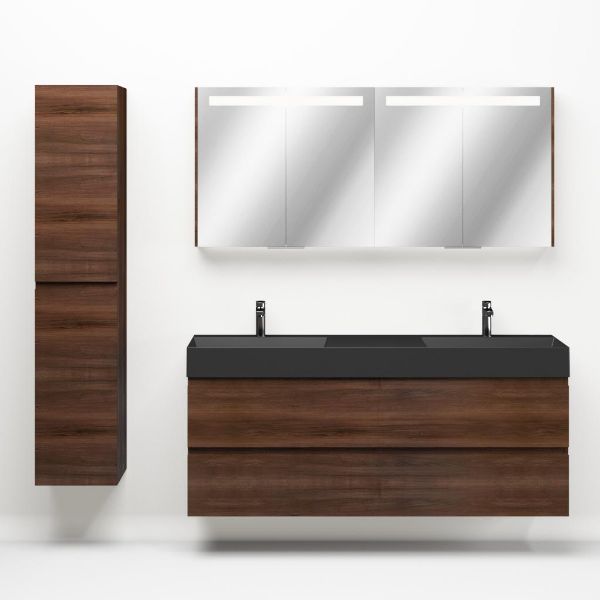 Greeploos badkamermeubel in de kleur walnoot is 160 cm breed. De wastafel is vervaardig in keramiek en heeft de kleur antraciet mat keramiek. Dit badkamermeubel met deze wastafel is leverbaar tussen de 60 cm t/m 160 cm