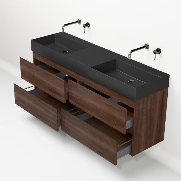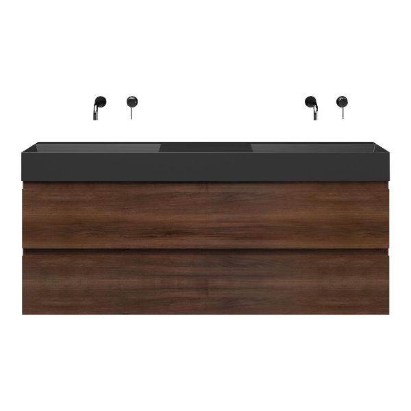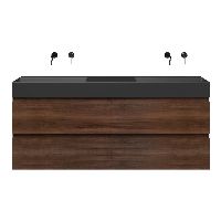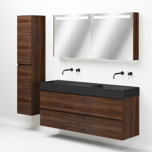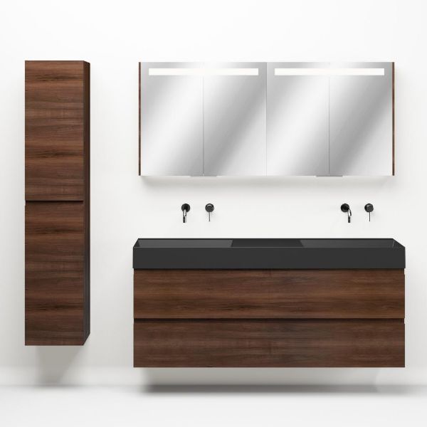 Greeploos badkamermeubel in de kleur walnoot is 160 cm breed. De wastafel is vervaardig in keramiek en heeft de kleur antraciet mat keramiek. Dit badkamermeubel met deze wastafel is leverbaar tussen de 60 cm t/m 160 cm
