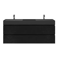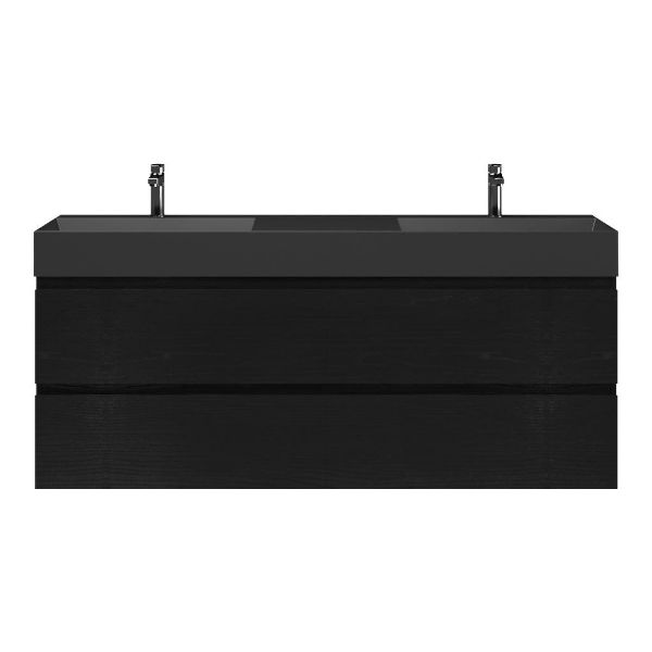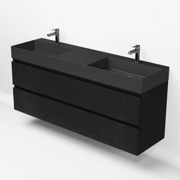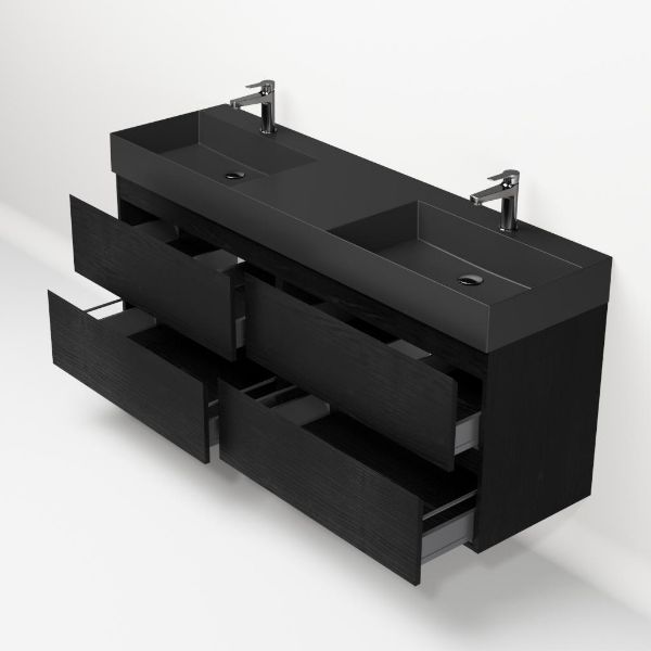 Greeploos badkamermeubel in de kleur zwart mat eiken is 160 cm breed. De wastafel is vervaardig in keramiek en heeft de kleur antraciet mat keramiek. Dit badkamermeubel met deze wastafel is leverbaar tussen de 60 cm t/m 160 cm