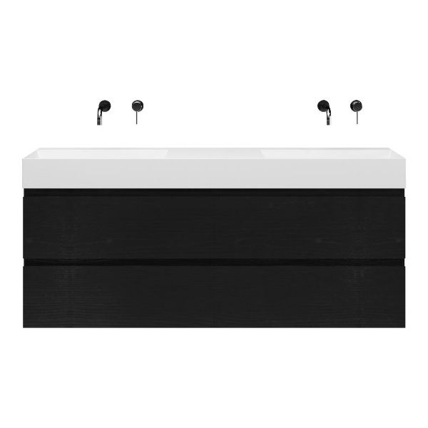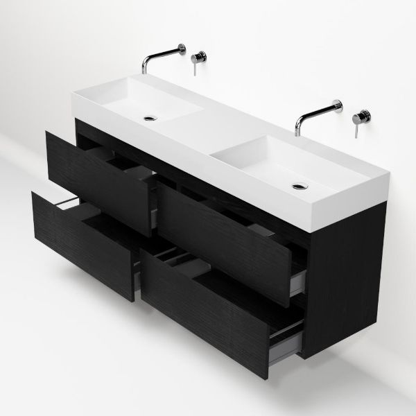 | | Bellanti Gisella/Azzurra badmeubel 160x46 4 softclose laden mat zwart eiken greeploos keramiek dubbele wastafel wit zonder kraangaten |