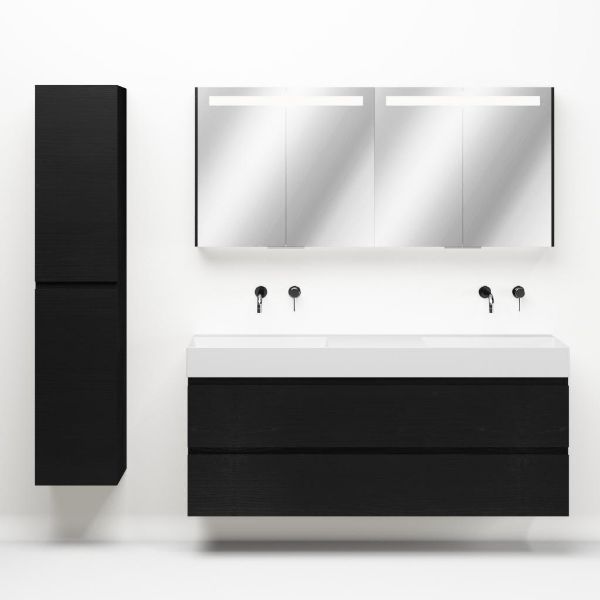 Greeploos badkamermeubel in de kleur zwart mat eiken is 160 cm breed. De wastafel is vervaardig in keramiek en heeft de kleur wit keramiek. Dit badkamermeubel met deze wastafel is leverbaar tussen de 60 cm t/m 160 cm
