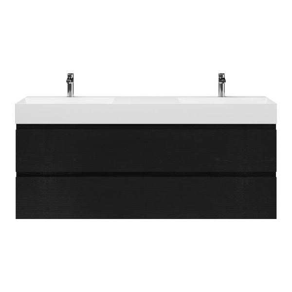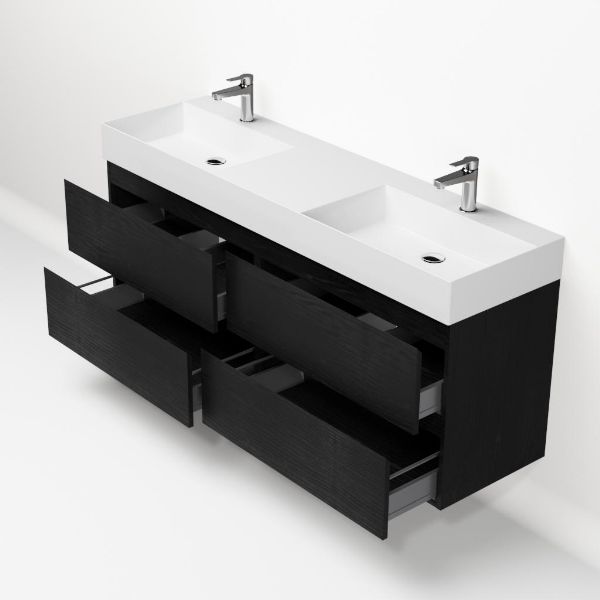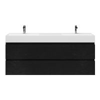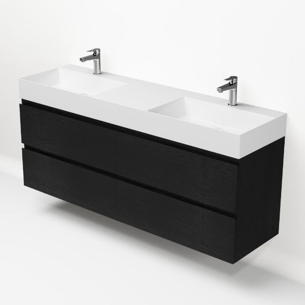 Greeploos badkamermeubel in de kleur zwart mat eiken is 160 cm breed. De wastafel is vervaardig in keramiek en heeft de kleur wit keramiek. Dit badkamermeubel met deze wastafel is leverbaar tussen de 60 cm t/m 160 cm