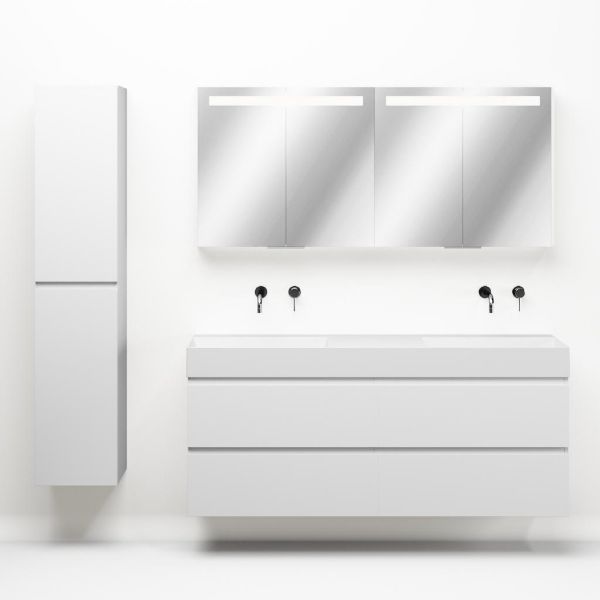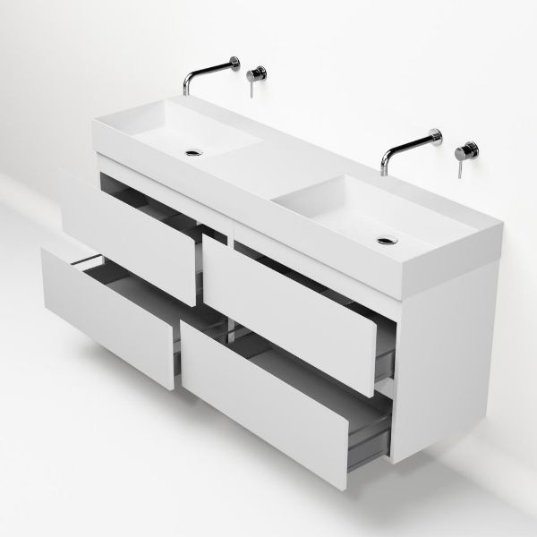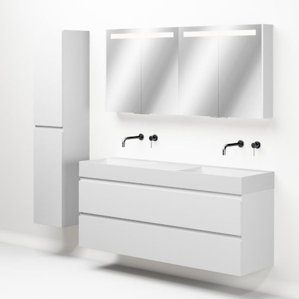 Greeploos badkamermeubel in de kleur wit mat is 160 cm breed. De wastafel is vervaardig in keramiek en heeft de kleur wit keramiek. Dit badkamermeubel met deze wastafel is leverbaar tussen de 60 cm t/m 160 cm
