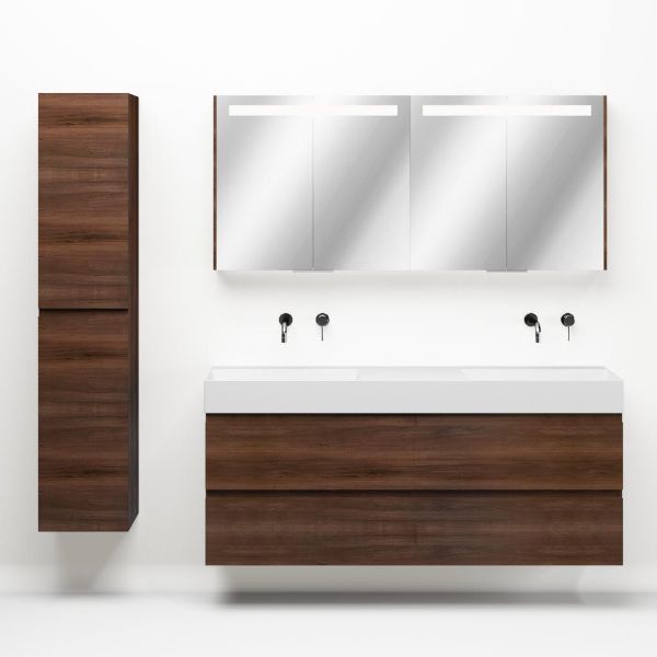 Greeploos badkamermeubel in de kleur walnoot is 160 cm breed. De wastafel is vervaardig in keramiek en heeft de kleur wit keramiek. Dit badkamermeubel met deze wastafel is leverbaar tussen de 60 cm t/m 160 cm