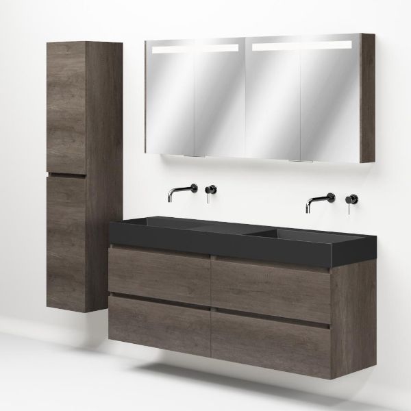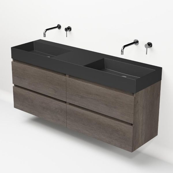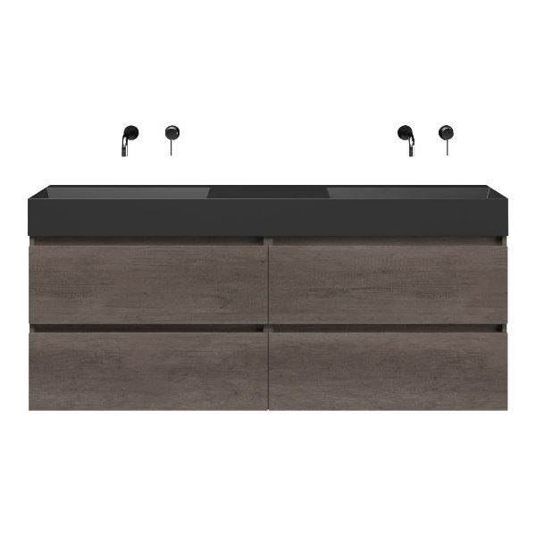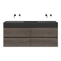 Greeploos badkamermeubel in de kleur olm donker grijs is 160 cm breed. De wastafel is vervaardig in keramiek en heeft de kleur antraciet mat keramiek. Dit badkamermeubel met deze wastafel is leverbaar tussen de 60 cm t/m 120 cm