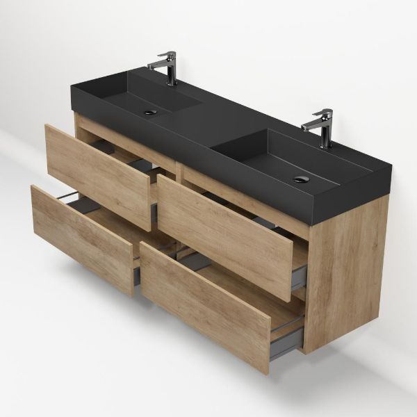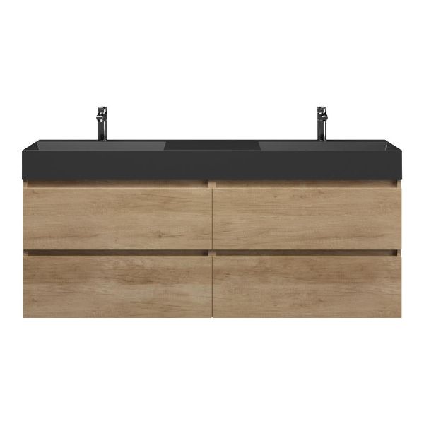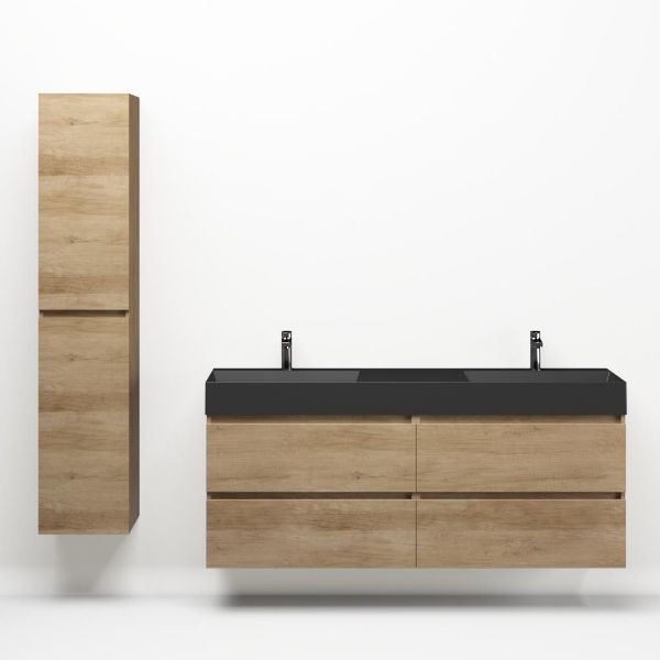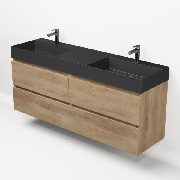Greeploos badkamermeubel in de kleur olm is 160 cm breed. De wastafel is vervaardig in keramiek en heeft de kleur antraciet mat keramiek. Dit badkamermeubel met deze wastafel is leverbaar tussen de 60 cm t/m 120 cm