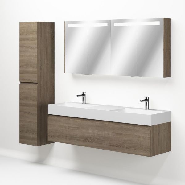 Greeploos badkamermeubel in de kleur eiken donker is 160 cm breed. De wastafel is vervaardig in keramiek en heeft de kleur wit mat keramiek. Dit badkamermeubel met deze wastafel is leverbaar tussen de 60 cm t/m 160 cm