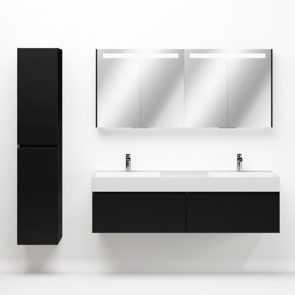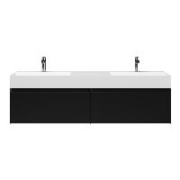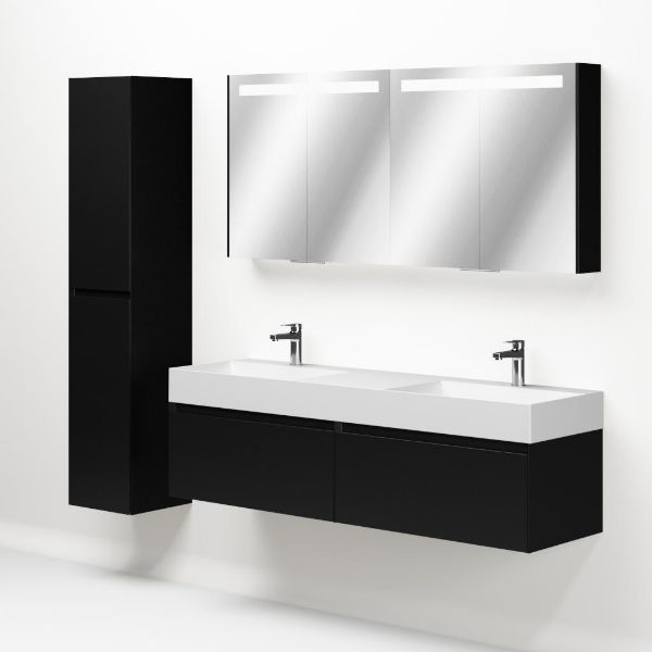 Greeploos badkamermeubel in de kleur zwart mat is 160 cm breed. De wastafel is vervaardig in keramiek en heeft de kleur wit mat keramiek. Dit badkamermeubel met deze wastafel is leverbaar tussen de 60 cm t/m 160 cm