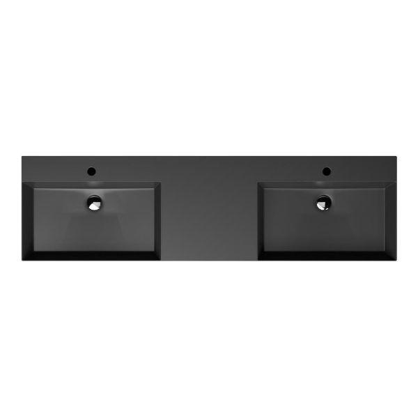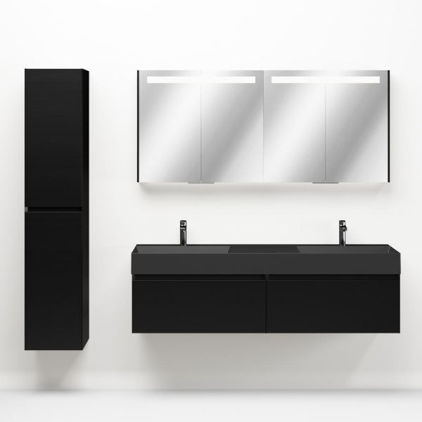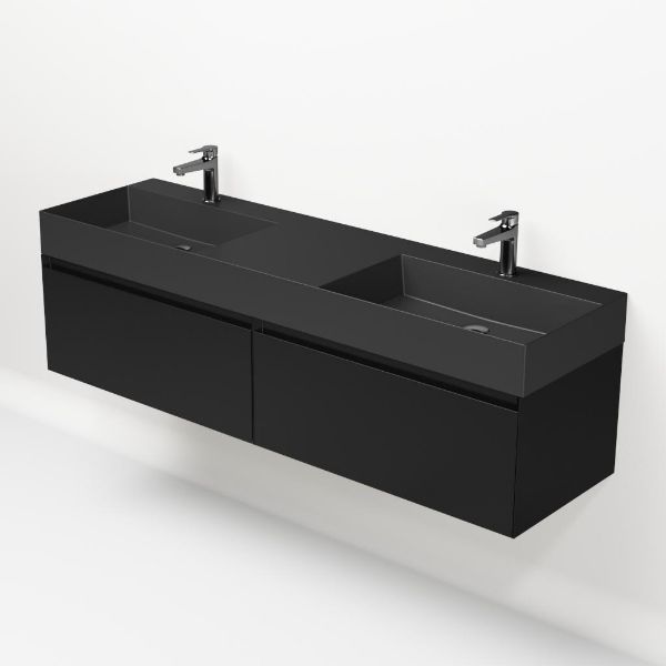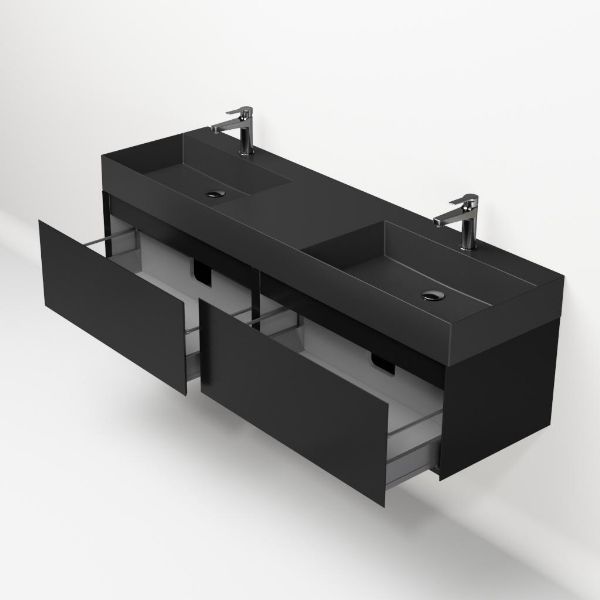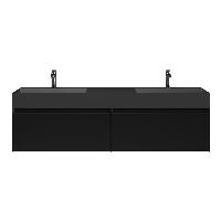 Greeploos badkamermeubel in de kleur zwart mat is 160 cm breed. De wastafel is vervaardig in keramiek en heeft de kleur antraciet mat keramiek. Dit badkamermeubel met deze wastafel is leverbaar tussen de 60 cm t/m 160 cm