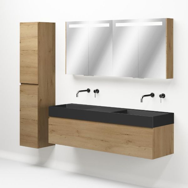 Greeploos badkamermeubel in de kleur eiken natuur is 160 cm breed. De wastafel is vervaardig in keramiek en heeft de kleur antraciet mat keramiek. Dit badkamermeubel met deze wastafel is leverbaar tussen de 60 cm t/m 160 cm