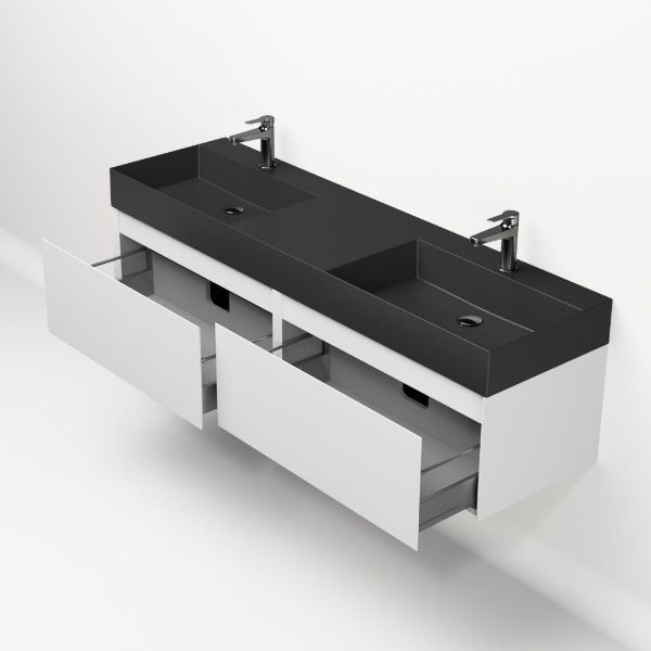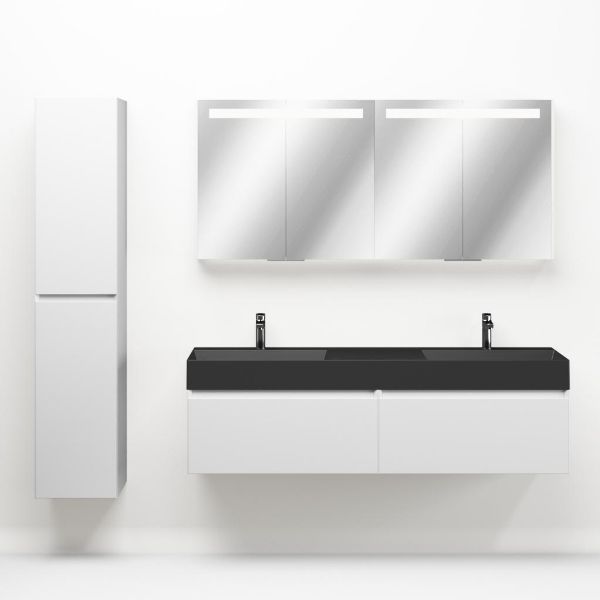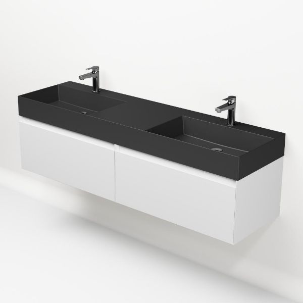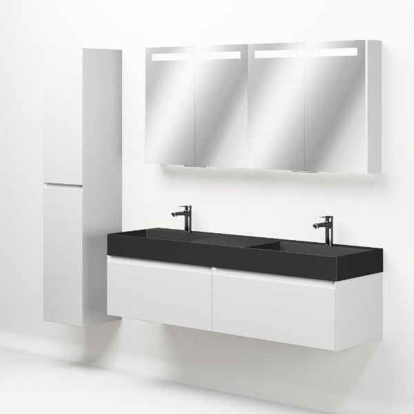 Greeploos badkamermeubel in de kleur wit mat is 160 cm breed. De wastafel is vervaardig in keramiek en heeft de kleur antraciet mat keramiek. Dit badkamermeubel met deze wastafel is leverbaar tussen de 60 cm t/m 160 cm