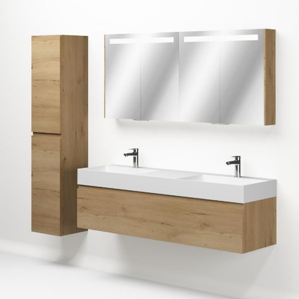 Greeploos badkamermeubel in de kleur eiken natuur is 160 cm breed. De wastafel is vervaardig in keramiek en heeft de kleur wit mat keramiek. Dit badkamermeubel met deze wastafel is leverbaar tussen de 60 cm t/m 160 cm