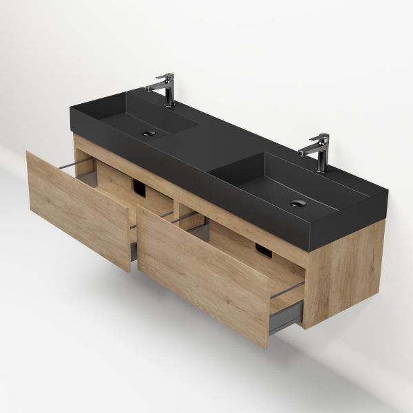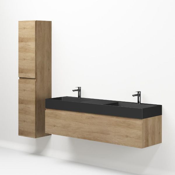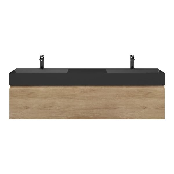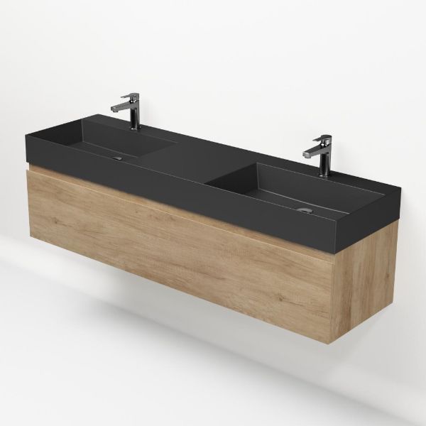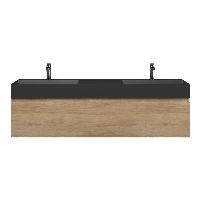 Greeploos badkamermeubel in de kleur olm is 160 cm breed. De wastafel is vervaardig in keramiek en heeft de kleur antraciet mat keramiek. Dit badkamermeubel met deze wastafel is leverbaar tussen de 60 cm t/m 160 cm