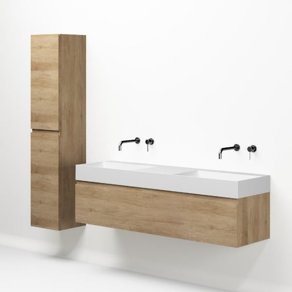 Greeploos badkamermeubel in de kleur olm is 160 cm breed. De wastafel is vervaardig in keramiek en heeft de kleur wit mat keramiek. Dit badkamermeubel met deze wastafel is leverbaar tussen de 60 cm t/m 160 cm