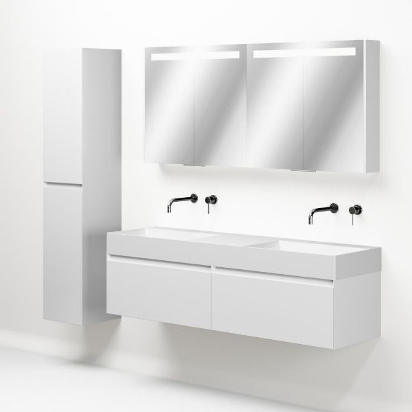 Greeploos badkamermeubel in de kleur wit hoogglans is 160 cm breed. De wastafel is vervaardig in keramiek en heeft de kleur wit mat keramiek. Dit badkamermeubel met deze wastafel is leverbaar tussen de 60 cm t/m 160 cm