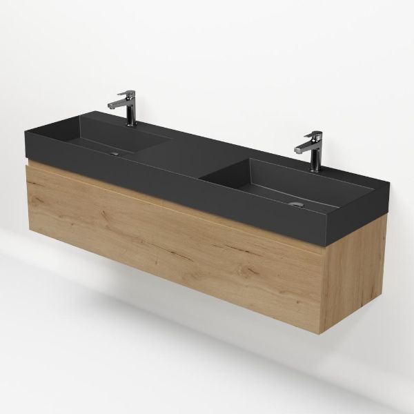 Greeploos badkamermeubel in de kleur eiken natuur is 160 cm breed. De wastafel is vervaardig in keramiek en heeft de kleur antraciet mat keramiek. Dit badkamermeubel met deze wastafel is leverbaar tussen de 60 cm t/m 160 cm