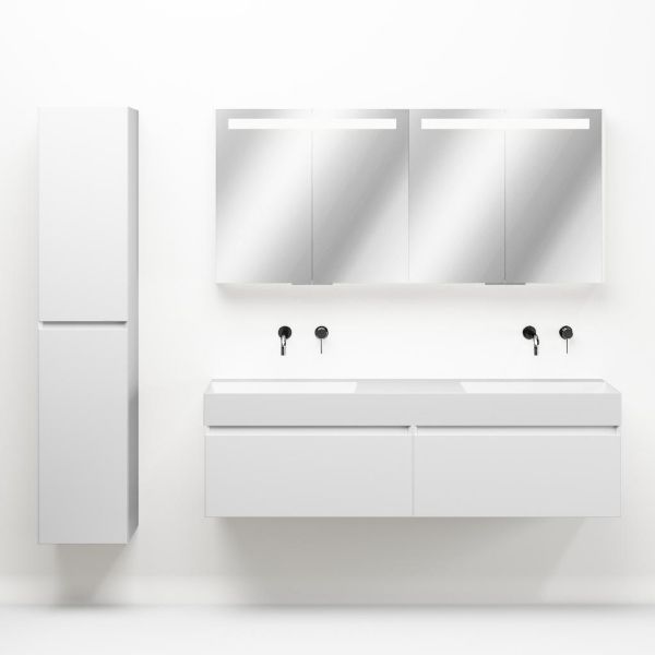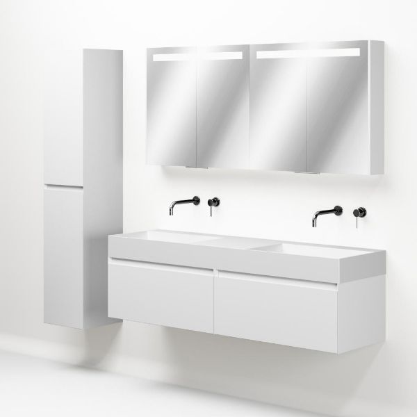 Greeploos badkamermeubel in de kleur wit mat is 160 cm breed. De wastafel is vervaardig in keramiek en heeft de kleur wit mat keramiek. Dit badkamermeubel met deze wastafel is leverbaar tussen de 60 cm t/m 160 cm