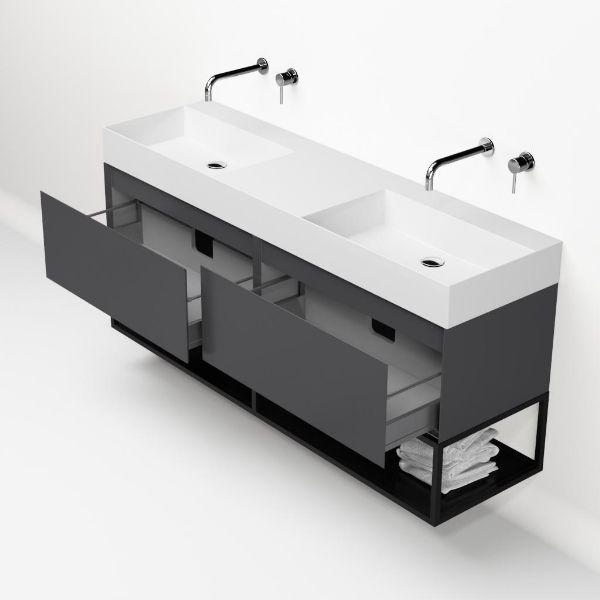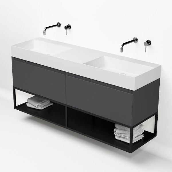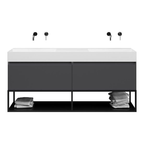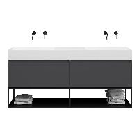 | | Bellanti Solo/Tela/Azzurra badmeubel 160x46 2 softclose laden mat antraciet greeploos keramiek dubbele wastafel wit zonder kraangaten met mat zwart metalen frame |