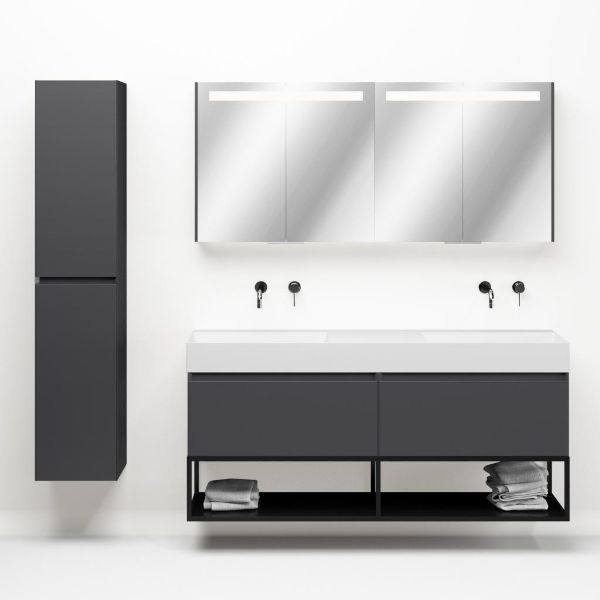 Greeploos badkamermeubel in de kleur antraciet mat is 160 cm breed. De wastafel is vervaardig in keramiek en heeft de kleur wit keramiek. Dit badkamermeubel met deze wastafel is leverbaar tussen de 60 cm t/m 140 cm