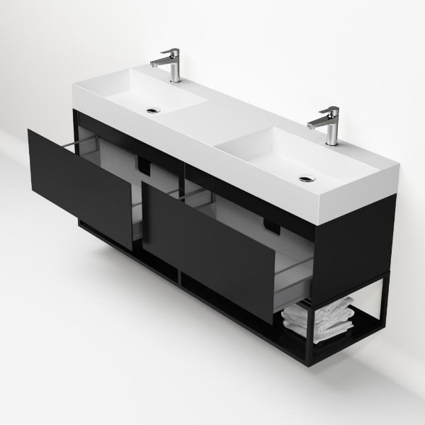 | Bellanti Solo/Tela/Azzurra badmeubel 160x46 2 softclose laden mat zwart greeploos keramiek dubbele wastafel mat wit met 2 kraangaten met mat zwart metalen frame |